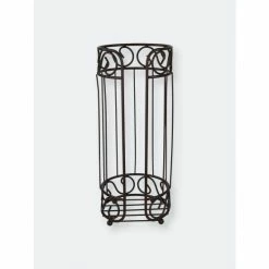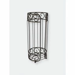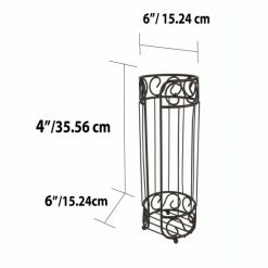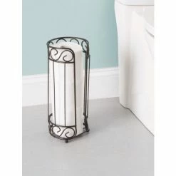Wide enough to fit even the largest size toilet tissue paper, this free-standing bath tissue reserve ensures guests and family have access to spare rolls. Tuck away in the corner or set it near the toilet! It’s slim size takes little room in the bathroom. The toilet paper holder features rasied feet to ensure toilet paper never hits the ground where it can easily get wet or dirty. And with ornate scroll detail in a rich bronze finish, this decorative holder will add classic style to the bath.