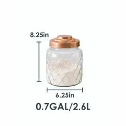 A nice change up from those the clear and silver colored jars it provides a roomy spot for all your dry foods, while add an inviting warm glean with its stunning copper top. Use it to provide stylish storage for spaghetti, trail mix, cookies, flour and more. No more worrying about your food becoming stale! It features an air-tight lid that seals in all the contents inside. The glass construction is heavy duty preventing it from easily breaking. The base is clear to make it easy to know when it’s time for a refill without lifting the lid. Beautifully decorated with ornate, etched detailing it’s perfect if you’re looking for a textural storage piece to complete the room. The top is made of sturdy steel and finished in a gleaming copper color that lends a sophisticated look to the countertop. As robust as it is elegant, it’s great to prevent cabinet clutter, while adding a stylish touch to your space.