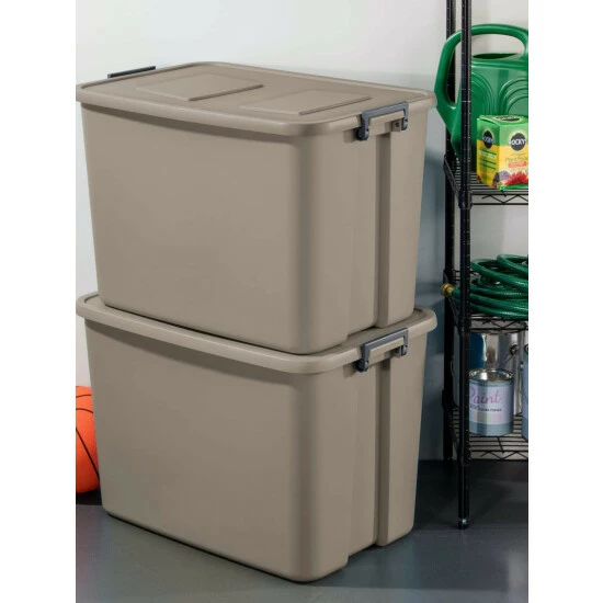 Need help getting organized? Step up to the product to solve a variety of basic household storage needs. Sort, store and conceal items in the garage, attic, basement, and closets. The color accent latches keep the lid secured to the base, yet are still easy to unlatch. This size Latch Tote is ideal for storing bedding, sporting gear, seasonal decorations and other large, bulky items. The contoured end panels and in molded handles provide a comfortable grip for lifting and carrying, making transporting the tote easier, whether moving into a dorm or storing away belongings in the attic or basement. The recessed lids allow same size totes to stack neatly on top of each other to use vertical storage space efficiently.