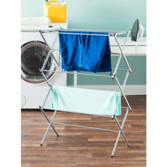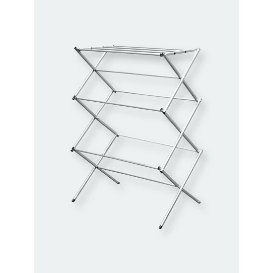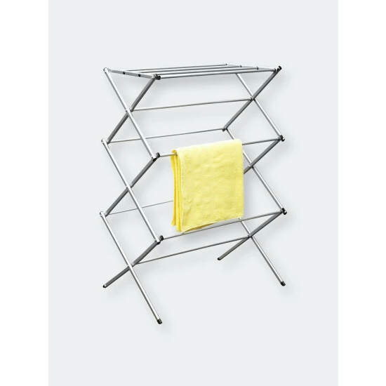 – Folding drying rack with 6 rods for ample drying space with a top tier for storing sweaters or flat drying delicate items