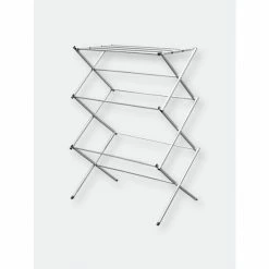 Fed up with your dryer destroying your clothes? Looking for an energy and space-saving solution for air drying laundry. Look no further than this foldable drying rack to gently and safely dry fabrics, while still preserving the quality of your laundry longer. Unlike wooden drying racks that are prone to breakage, it’s made of enamel coated steel for strength and durability, even stocked up with a large load. It’s lightweight and portable so you can easily place it out on the deck on a sunny day or in the laundry room on rainy day. The top tier features 4 rods that are designed horizontally to create a flat surface for naturally drying sweaters or flat drying delicate items. An additional 6 rods offer ample hanging space for socks, underwear, jeans, and shirts. The drying rack comes fully assembled with no tools required to install. When you’re all done, it collapses flat so you can easily store it discreetly behind a door to save space or next to the washing machine to have it easily accessible for next time.
