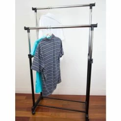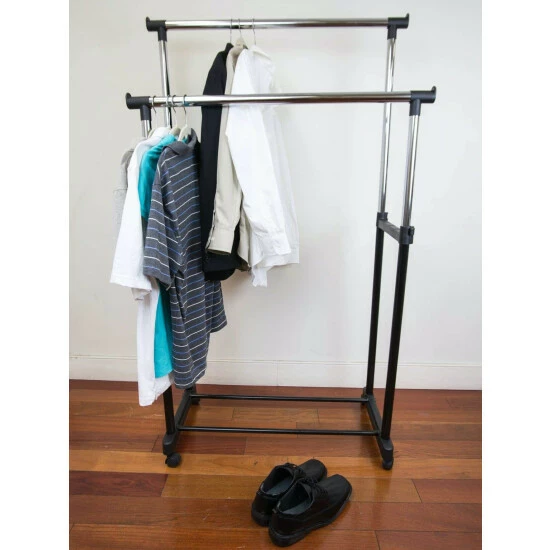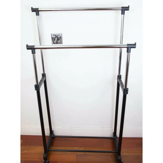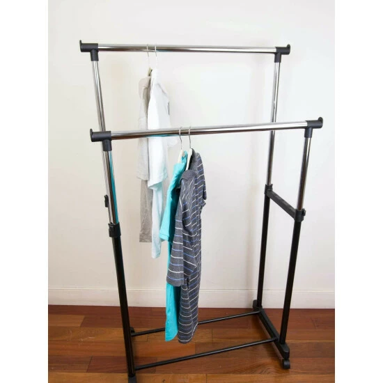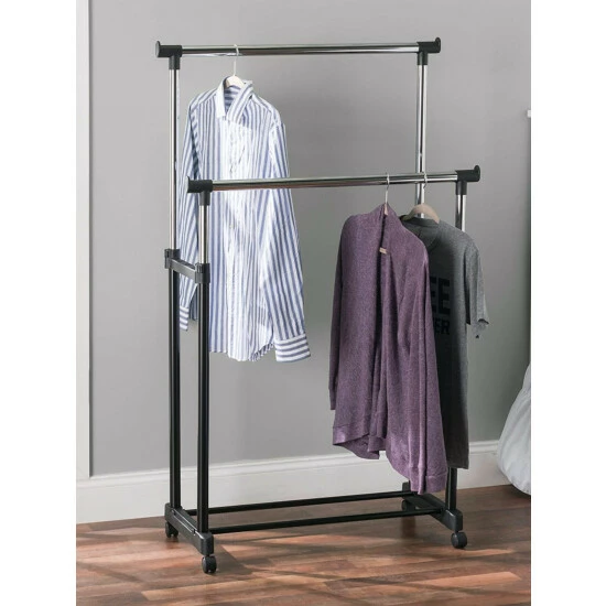 Whether you are running a fashion show or need to bring your wardrobe to your dorm room, this double garment rack makes it easy to transfer your clothes wherever you desire. The rack features double bars to organize an ample amount of clothing, from your finest dress shirts, suits, jackets and more. It easily extends from 36.75″ to 66″ to provide you with even more additional portable storage space. Smooth caster wheels make it easy to roll from room to room or even outdoors and lock in place when needed.
