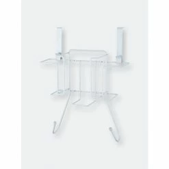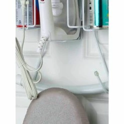 Save space with this convenient over the door ironing board holder. Features two compartments to hold sprays and a middle compartment to hold one iron. The hooks conveniently holds one ironing board. No installation is necessary, just attach it on the top of the door and its ready to use. Made of steel.