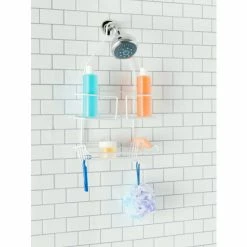 – 1 deep basket for bottle shampoo, shallow bottom shelf for smaller shower accessories, and bottom hooks for razors
