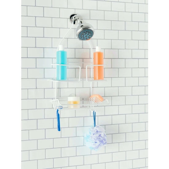 Most shower caddies are big and bulky, but this compact shower caddy is perfect if you a desire a minimalist set up for your shower. With strong metal wires and an anti-slip collar it rests snugly on the pipe of your shower head with minimal swaying. The frame is thickly coated with vinyl so you don’t have to worry about rust or corrosion building up. For such a small footprint, it offers generous storage options to organize all your bath and shower essentials. The top deep basket provides plenty of room for large shampoo and conditioner containers, a lower and more shallow shelf for face wash and brushes, an fast-drying angled soap dish that drains water efficiently so your bar of soap remains dry and last longer. The wide hook along the side of the caddy is incredibly useful for holding several bath poufs and loofas or razors.